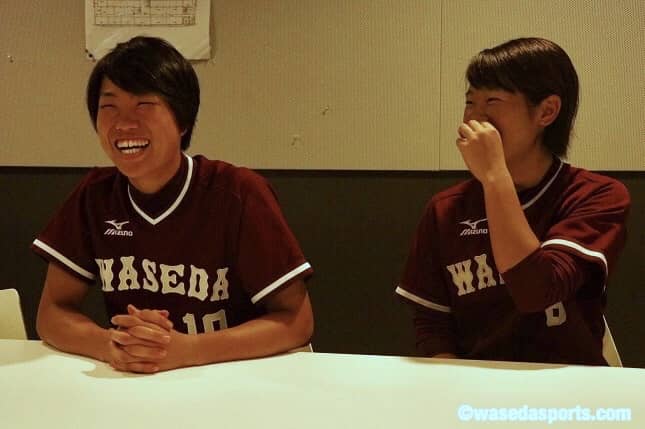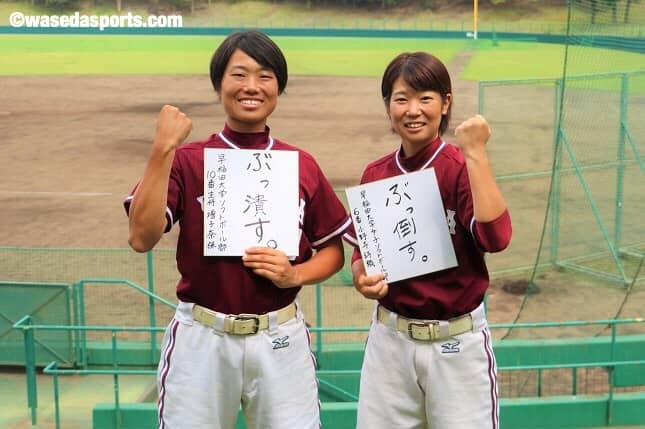 野球、ソフトボールにおいて守備で最も重要視されているといっても過言ではないセンターライン。その中でも特に阿吽の呼吸が求められ、守備の要として欠かすことのできないポジションが二遊間である。今回はその二遊間を守り、かつ攻撃においても中軸を任されている増子奈保主将(スポ4=東京・日出)と小野寺詩織(スポ3=千葉経大付)の二人に、ここまでの振り返りやインカレへの意気込み、はたまたプライベートな話に至るまで様々なお話を伺った。