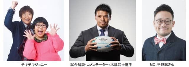 試合解説とコメンテーターは、2015年ラグビーW杯の日本代表選手で現在はトップリーグ日野レッドドルフィンズで活躍する木津武士選手、MCはラグビー経験のあるタレントの平野聡さんが担当。ゲストには、お笑い芸人のチキチキジョニーさんがラグビー初心者の代表として登場する。