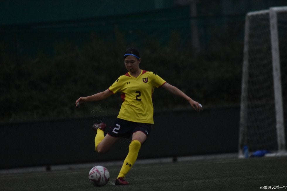 前節、立ち上がりで苦しんだ慶大だったが順調に試合に入った。また、効果的な攻撃ができなかった前節の後半と異なり、アタッキングサードでの精度が改善されていた。一方の筑波大は5バックでスペースを埋めた。12分、松木里緒(環4・常盤木学園)がボールを奪ったところから山本華乃(理3・横須賀シーガルズ)がブラフ フェイ(文1・スフィーダ世田谷FCユース)へスルーパス。ブラフはドリブルで持ち込んでシュートしたがGK正面に飛んだ。機を見て前線からプレスをかける筑波大にペースを乱されるシーンも時おり見られたが、丁寧な足元での繋ぎや奥本くるみ(環4・浦和レッズレディースユース)、工藤真子(総4・日テレ・メニーナ)のドリブルでこれを回避。回避した先にある中盤の広いスペースでボランチが前を向いて前進した。42分にはそういった形から敵陣に侵入し、最後は山本がゴールを狙う良い攻撃が見られた。
