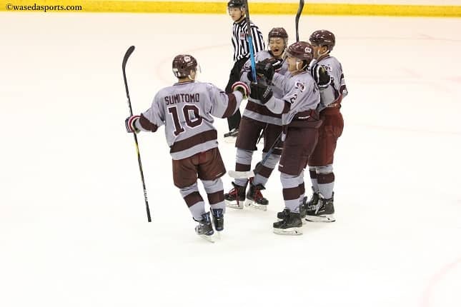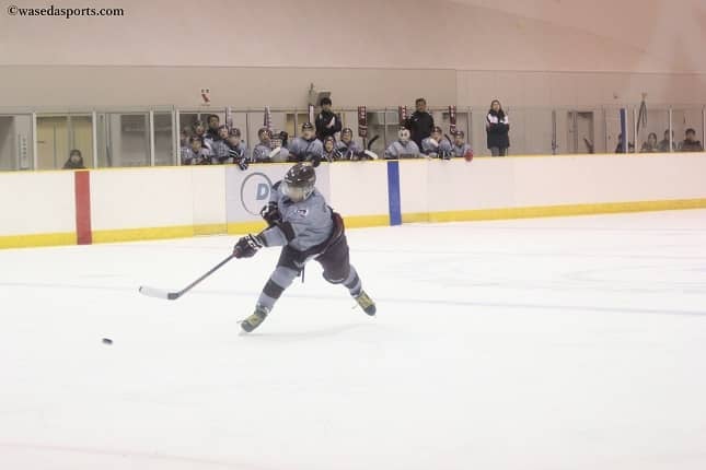 第1P(ピリオド)序盤こそ、日大のフォアチェックによりなかなか得点を奪えないが、14分53秒にFW杉本華唯(スポ2=北海道・駒大苫小牧)がようやく1点目を奪うとこれを皮切りに得点を重ねていく。徐々に早大が試合の流れをつかみ、杉本、FW澤出仁(スポ3=北海道・武修館)と好調の第1セットが続けてゴールを決める。第2PにはFW生江太樹(スポ3=北海道・釧路江南)がゴール前でしつこく攻め続け最後はパックを押し込むと、スコアは4-0。直後に日大に得点を許したものの、「2試合連続でゴールできたことは大きかった」というFW北村瑞基(商2=東京・早実)のゴールなどで、相手に反撃の余地を与えない。たくさんシュートを打ち、二次攻撃、三次攻撃につなげるという早大らしいプレーを見せ、第2Pが終わった時点でスコアは7-1、シュート数でも4倍以上の42-10と相手を圧倒する。