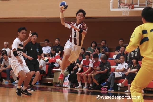 早大の立ち上がりは順調だった。開始直後に決まったRW清原秀介(商4=東京・早実)の速攻を皮切りに、着実に点数を重ねていった。日体大も負けじと点を入れ返してくるが、シュートミスやパスミスによるこぼれ球を拾い早大は相手のゴールを揺らす。LW前田理玖(スポ3=福井・高志)やCB宮國義志(社4=沖縄・浦添)は果敢に速攻を仕掛け、確実に得点。日体大はGK中村匠(スポ2=千葉・市川)が「速攻が速くて、戻らないとすぐに点を取られてしまう」と振り返るように、攻守の切り替えが早く点を決めても気が抜けない相手ではあったが、早大のディフェンス陣の好プレーで逆速攻を防ぐ場面も多く見られた。DF岡本隼(商3=滋賀・彦根東)が相手の攻撃をしっかりと止め切り、生んだチャンスを前田や宮國がつなげ、13分には9-7と早大が2点をリードする展開に。このまま試合の流れを掴めるかと思われたが、相手もリードをやすやすと許すわけではない。相手はGK羽諸大雅(スポ4=千葉・市川)の隙を狙い、次々とシュートを入れてきた。4連続得点を許し劣勢に立たされた早大。しかし、タイムアウト後出場した阿南遼星(スポ3=大阪・大体大浪商)によって生まれた相手の2分間退場で、再び崩れた攻めの姿勢を取り戻す。相手のルーズボールを生かした阿南のシュートや清原のループシュートが決まり点差は1点に。残り1分を切ったところで、宮國とPV中村祐貴(スポ3=北海道・札幌西)が立て続けに得点し同点に追いついたが、終了間際に放った相手のボールが早大のゴールを揺らし、14-15と1点ビハインドで試合を折り返すこととなった。