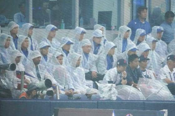 雨の中で日本対アメリカ戦を観戦するU18韓国代表選手たち【写真:荒川祐史】