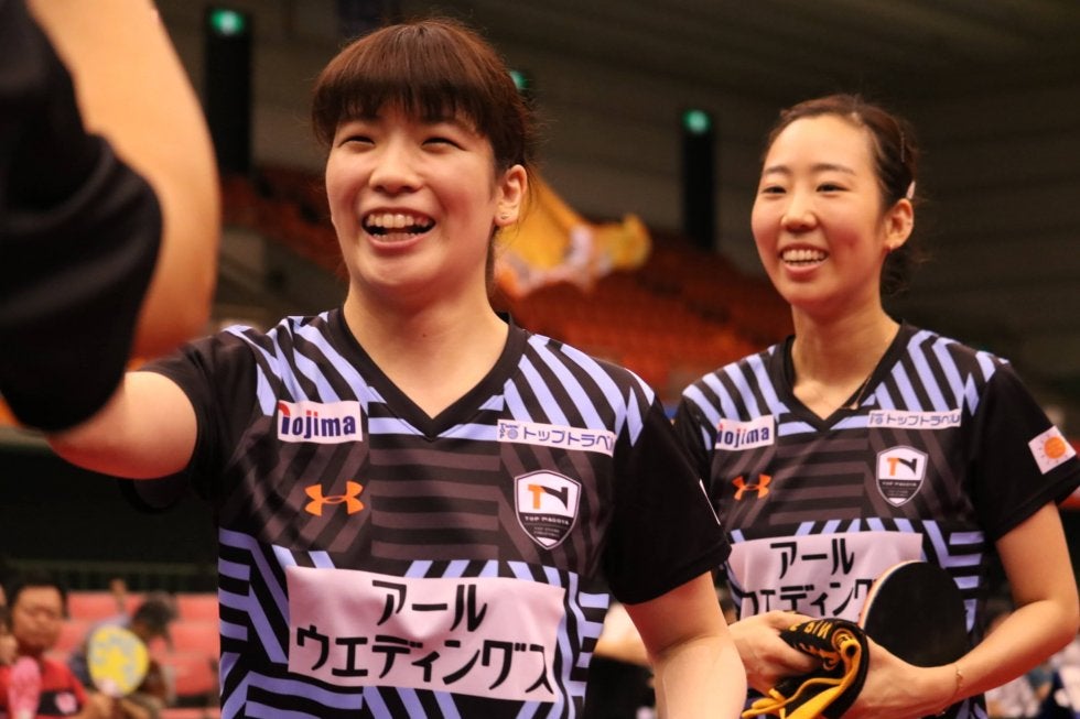 写真:ダブルスを制したTOP名古屋の鈴木(写真左)/梁夏銀(写真右)ペア/撮影:ラリーズ編集部