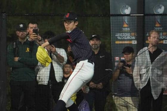 台湾戦の試合中にブルペン入り、座らせて約30球を投げ込む日本 – 台湾(2日・機張)「第29回 WBSC U…