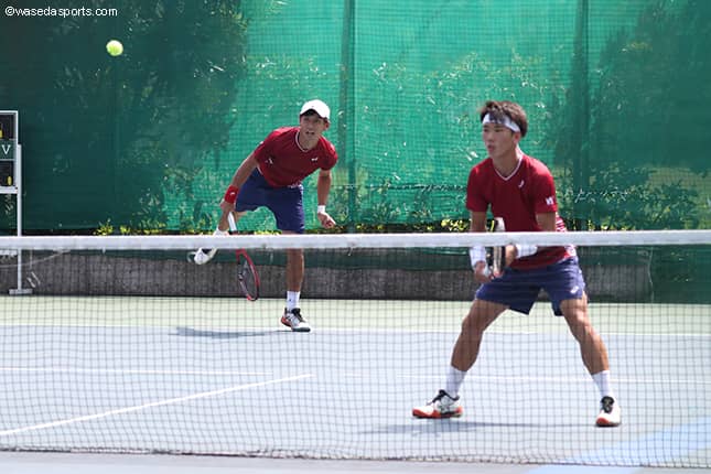 まずはダブルス3ペアが試合に臨んだ。チームに初勝利を持ち帰ったのはダブルス1の島袋将副将(スポ4=三重・四日市工)・千頭昇平(スポ3=愛知・誉)組。この2人がペアを組むのは久しぶりだったが、「コンビネーション的にもお互い合ってきている」(島袋)というように、強力なサーブや正確なボレーで相手を圧倒。夏関2位の強敵相手にストレート勝ちを決めた。続いて、ダブルス3の古賀大貴(スポ4=大分舞鶴)・安上昂志(スポ4=福岡・柳川)が4年生ペアの安定感を見せつける。気迫あふれるプレーでストレート勝ちを収め、チームに2勝目をもたらした。このままダブルスは全勝するかと思われたが、ダブルス2でインカレ優勝組である木元風哉(社3=埼玉・早大本庄)・田中優之介(スポ3=埼玉・秀明英光)組がまさかの敗戦。「良くないミスが続いた」(木元)というように中盤以降ミスを重ね、セカンドセットを落とすとファイナルセットは強力なストロークで攻めるも、なかなか相手を崩しきれず、タイブレークまでもつれ込んだ末に敗れた。