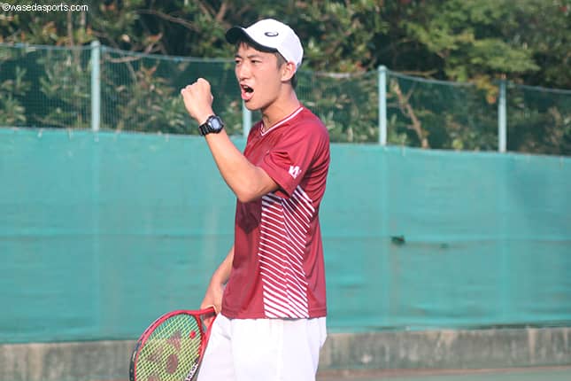 まずはダブルス1として出させていただいて、早慶戦以来の団体戦でチームでやるのも久々だったんですけど、出だしからいい雰囲気で僕自身はできたかなって思います。シングルスも勝負決まったなかでの試合で、やりにくいなかでの試合になるのは最初からわかってたので、ある程度準備はできてたんですけど、なかなか思うようにはテニスができなくて。でもそのなかでもストレートで勝てたというのは大きいんじゃないかなと思います。