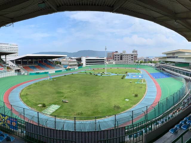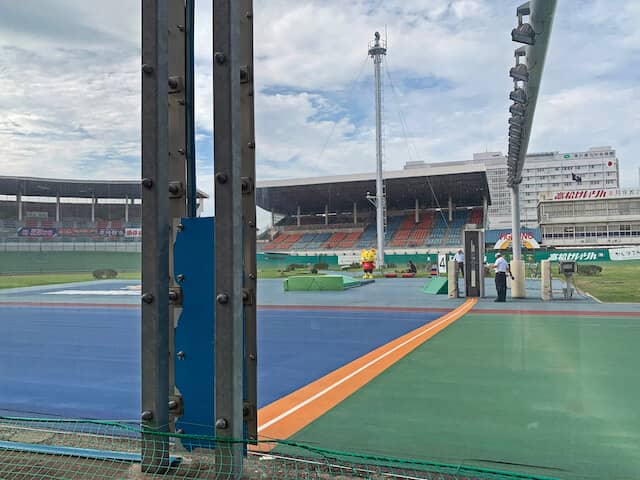 スタンドの一番上までいってみると高松競輪場を一望できる見晴らしに、思わず息を呑みました。しかし、季節は真夏です……感動で一瞬だけ忘れていた暑さがすぐに戻ってきて、汗が吹き出してきました。これ以上の探索を続けると、次のトークショーに支障をきたしそうだったので、階段を降りて、足早にバックまで確認すると、そこでUターン。