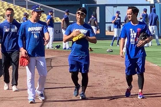 ドジャース・ロバーツ監督(中央)と会話を交わした前田健太(右)【写真:盆子原浩二】