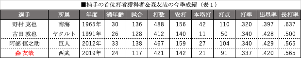 これまで捕手として首位打者に輝いたのは、たった3人。改めて「打てる捕手」だった先人たちを振り返ってみたい(表1)。