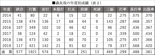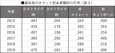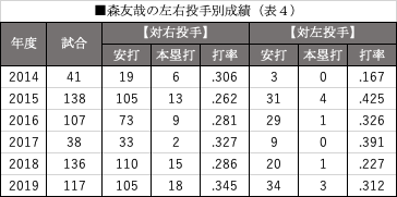 そして投手の左右をも苦にしない。森の左右投手別成績(表4)を見ると、1年目の2014年は左投手に苦しみながら2年目に克服。昨季は再び対左に苦しんだが、今季はしっかりと修正している。この対応&成長力が、森の大きな魅力である。