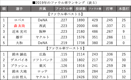今後の発展・改善点はどこか。一つのヒントが、2019年のファウル率ランキング(表5)に隠されている。打者のファウル数、その確率が分かるが、森はファウル率で現在2位、パ・リーグではトップの数字となっている(9月3日終了時点)。よく言えば「粘っている」と評価できるが、悪く言えば「捉えきれていない」とも言える。