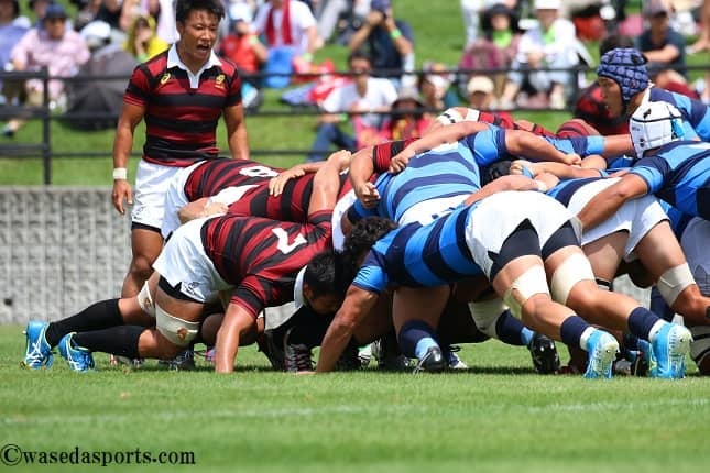 対する青学大。早大より1日遅れでシーズンをスタートさせた。初戦の相手は慶大。FW戦では完敗したが、幾度となくディフェンスで粘りを見せ、慶大の反則を誘う。特にノットリリース・ザ・ボールのペナルティー奪うなどブレイクダウンでの攻防に奮闘が見られた。アタックでは、NO・8下里雄大主将(青学大)のボールキャリーから何度も慶大ディフェンスラインを突破していた。また、両WTBには快足ランナーがそろう。慶大戦では得点を奪うことはできなかったものの、青学大のスピーディーな攻撃には警戒が必要だ。
