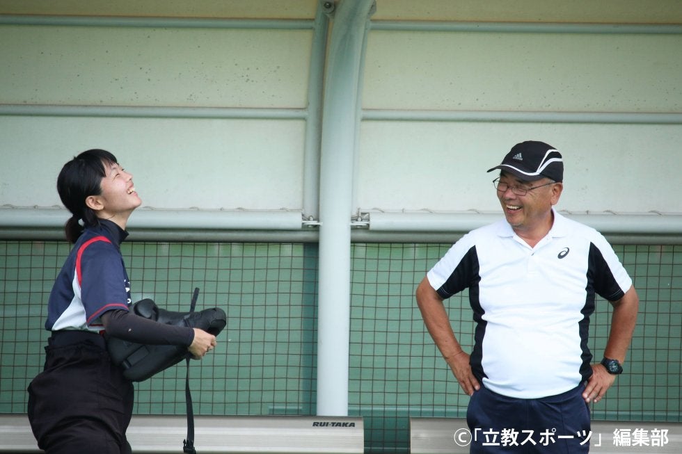 練習前、笑みを浮かべる市村(コ3)(右)と大平監督春は悔し涙を流した。春季リーグ戦は入れ替え戦で、上智大に1-2で敗れた…