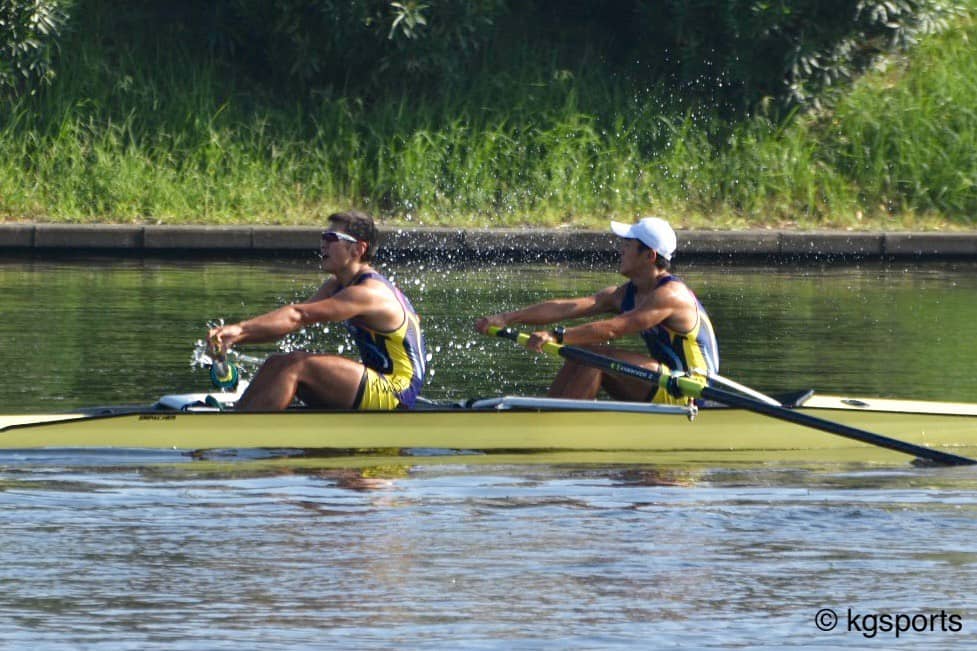 <写真・力強い漕ぎを見せる男子舵手なしペア>