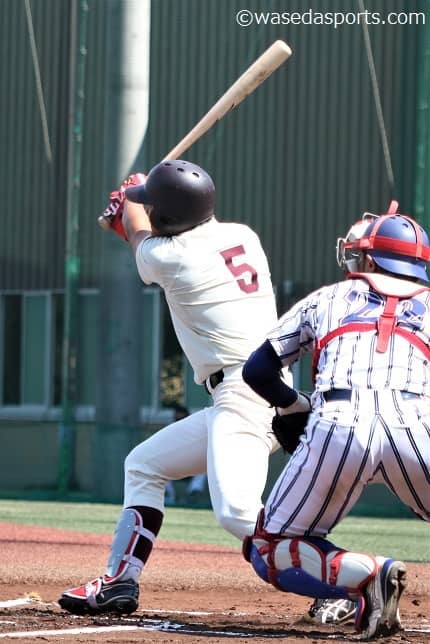 初回から早大打線が爆発した。7が中前打で出塁すると、7が内角ストレートを捉える。右中間を破る適時二塁打を放ち1点を先制した。そして加藤も右前打し、1死一、三塁。すると続く7の打席で相手投手が暴投。その間、一塁にいた加藤は二塁へ。ここで流れを止めるわけにはいかない。檜村は低めの変化球を左前へ運んだ。左翼手の敵失もあり、加藤までも本塁生還した。打線はまだまだつながる。7が左前打を、さらに7は右中間を破る二塁打を放つ。送球が乱れる間に一塁走者・蛭間も生還した。続く7の打席でまたしても相手投手の暴投があり、さらにもう1点。初回に6点を奪った。そして3回、再び好機が到来する。先頭の蛭間が右前打で出塁。次打者は倒れ中川卓に打順が回る。甘く入った初球のストレートを逃さなかった。打球はぐんぐんと伸び右中間へ。これが適時二塁打となり、7点目を追加した。4回以降は安打が出るも得点には結び付かず。スコアボードにゼロが並んだ。