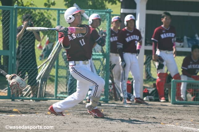 相手はエースの奥田拓海(3年)を先発のマウンドに上げるなど、必勝を期した布陣で試合に臨んだ。早大は序盤こそ奥田を攻略することはできなかったが、4回に川上卓也副将(スポ4=岡山・新見)が外角へのライズを右翼に運び、インカレ自身初本塁打を記録。続く石井智尋(スポ3=千葉・成田国際)も中堅右へ二者連続となる本塁打を放ち、3点のリードを奪うことに成功した。この回にさらに1点を追加するなど、早大はゲームの流れを自分たちの側へと一気に引き寄せた。