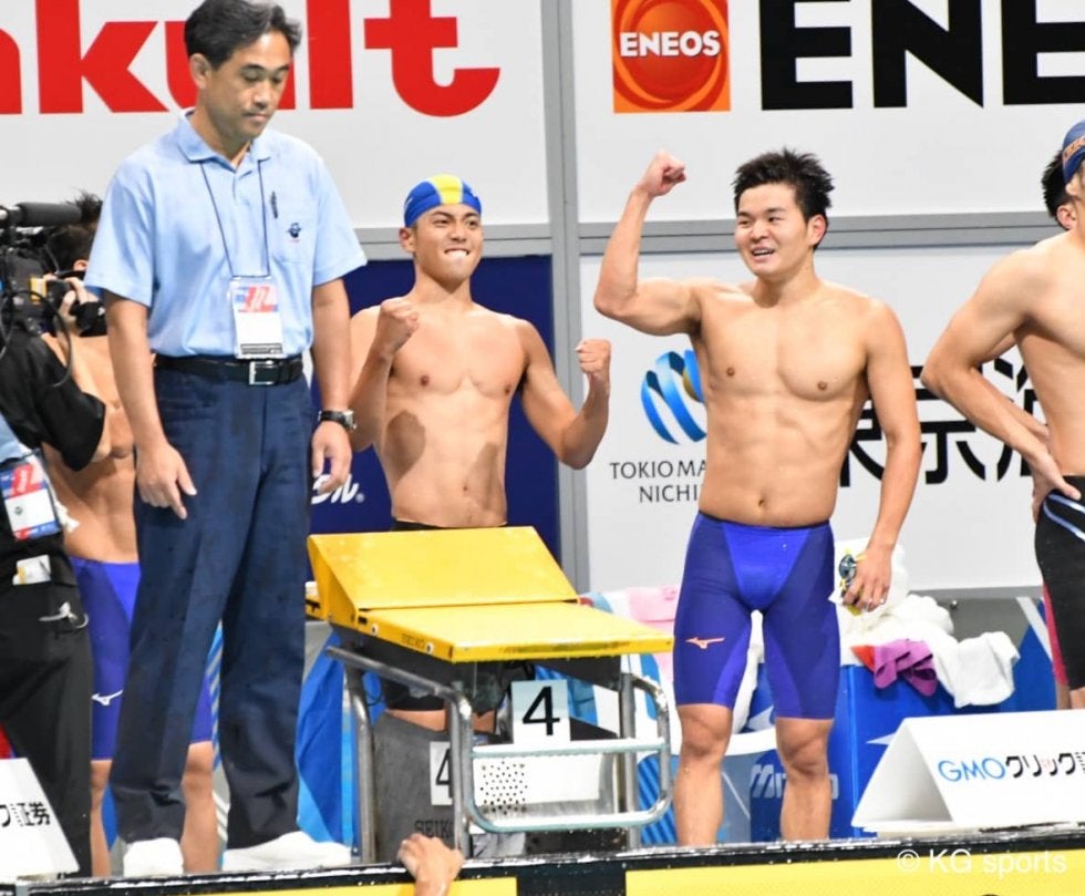 <写真・ガッツポーズをする佐多(左)と寺田> 9月6日、東京辰巳国際水泳場にて第95回日本学生選手権水泳競技大会競泳競…