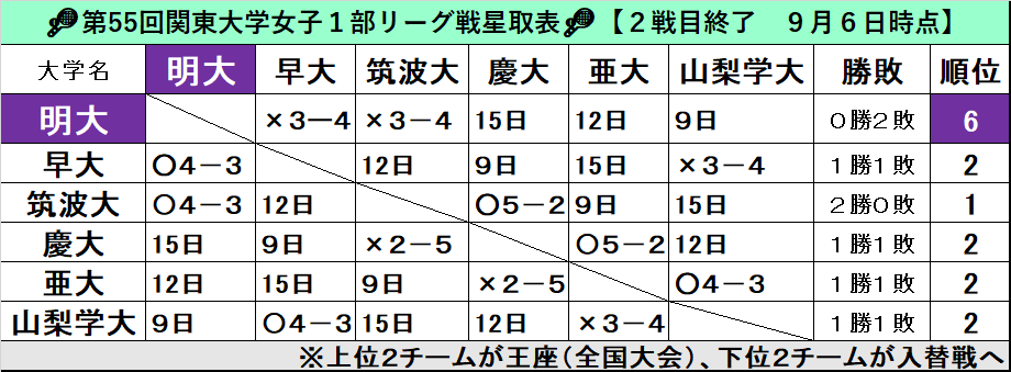 もう負けられない。2連敗の明大が王座進出に望みを託す方法はただ1つ。ここから3連勝することだ。「ダブルスがカギになる」(稲葉)。次戦は早大から勝利を収めた山梨学大戦。明大の逆襲劇に、期待したい。