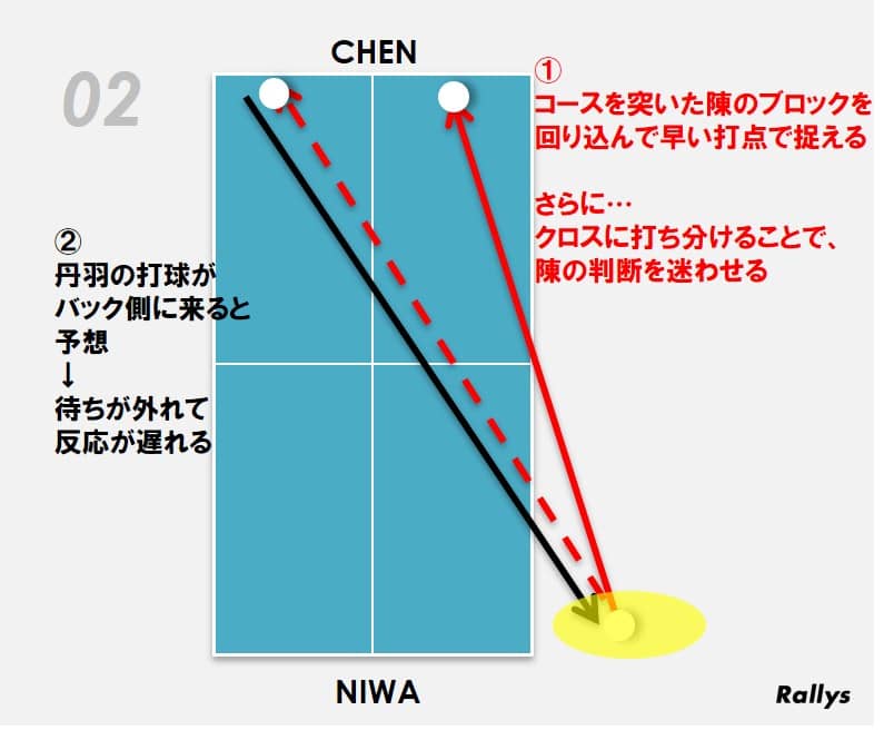 ラリー戦になると陳はチャンスが来るまではバックブロックで厳しいコースを狙う。しかし、厳しいコースを狙ったボールでも、丹羽は他の選手よりも早い打点で返球できる。その結果、丹羽は相手の意表をつくコースを攻めることができた。