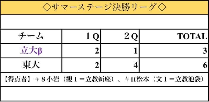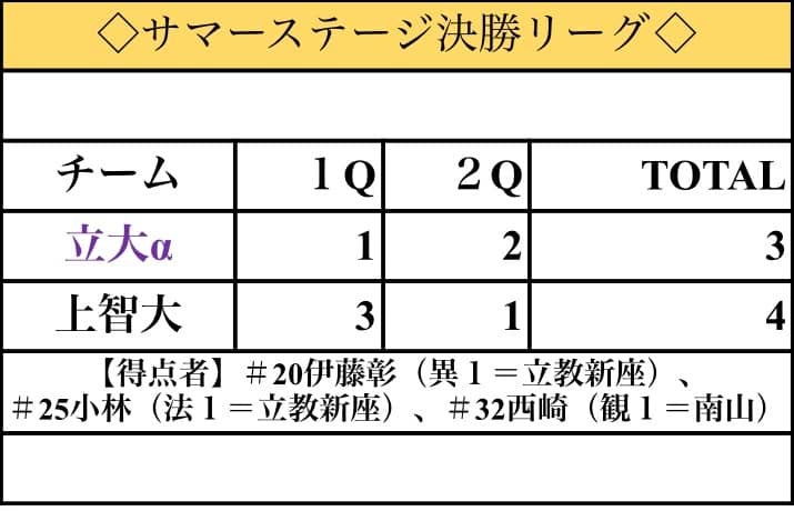 ほろ苦いデビューとなった、サマーステージ決勝。αのキャプテン#18小豆澤(営1)は「組織力には自信がある。あとは個の能力を高めていきたい」と意気込んだ。ウィンターステージでのリベンジを誓う彼らの戦いに目が離せない。
