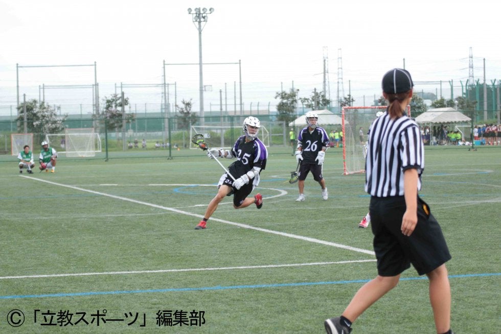 まさかの展開だった。優勝を目指し迎えた決勝リーグ初戦、先制したのは立大だった。開始30秒、ゴール前でパスを受けた#8小岩(観1)がショットを決めた。勢いそのままに、#1安藤(文1)の体を張ったディフェンスから#11松本(文1)へのパスが通り、2点目が入った。しかし、すぐさま2点を取り返され、第1Qを2-2のドローで折り返す。迎えた第2Q。勝利に向け、残された時間はあと6分。立大は、#1安藤を皮切りに何度もショットを打つが、なかなか決まらない。こぼれ球を取られるミスが相次ぎ、相手に4点を与えてしまった。#8小岩がゴールを回り、再びショットを決めるも、3-6で敗退した。