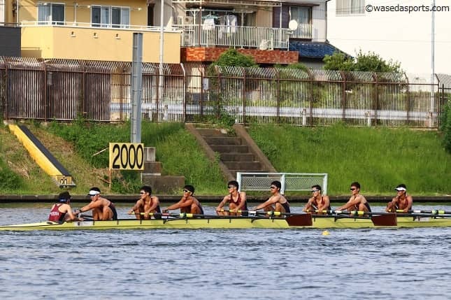 毎年インカレと並行して開催されるオックスフォード盾レガッタ。今年も早大からは1、2年生を中心としたフレッシュなクルーの男子エイトがエントリーした。予選では、スタートで他艇にリードを許すものの中盤以降は立て直し、2艇を追い抜く。しかし、本来のコンスタントレートに届かず、2位でフィニッシュした。敗者復活戦では、スタートから阪大Aと競り合うかたちに。一時はトップに立ったが終盤に失速し、この組2位で今大会を終えた。未経験入部の1年生らを乗せたフレッシュなクルーなりに一定の仕上がりを見せた。ここで得た経験を糧に、さらなる成長を目指す。
