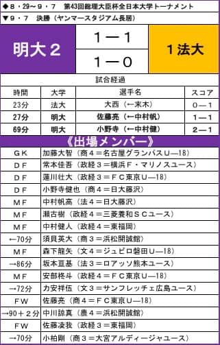 「法大が素晴らしいチームで、天皇杯でも勝ち進んでいます。我々は川崎フロンターレに負けたというのもあって、この大会でなんとしても明治の強さ、取り組んでいるものということを表して、自分たちのやってきたことが正しいということを証明するためにも勝ちにこだわっていました」