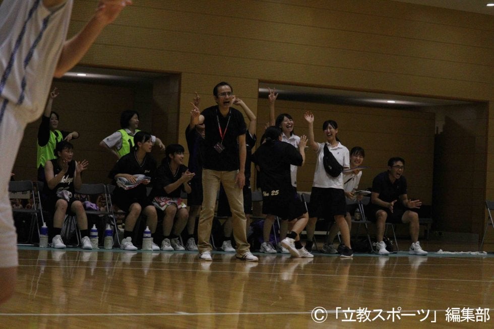 第1戦では開始6秒で#27小沼(営3)が先制点を取ると、立大が9点連続で得点を決めるなど好調な滑り出しを見せた。#26西山(営1)は1度シュートを外すも、自らリバウンドを取りシュートを決め2点をゲット。1年生ながらスタメンとして出場し、3Pシュートも決めるなど活躍が目立った。その後も立大得意のパス回しで相手を翻弄し9点リードで前半終了。試合を見ていた他大の選手が「立教強いな」と声をもらすほど、立大優勢の展開だった。