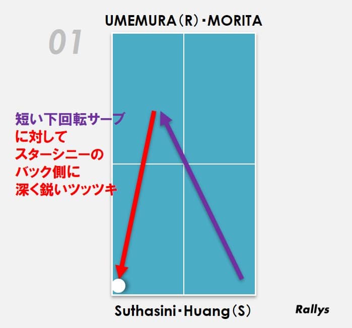 このレシーブに差し込まれる形になったスターシニーは、苦しい姿勢でフォアハンドドライブを放つもミス。梅村の強気のレシーブが貴重な1点を生み出した。また、このレシーブは2本目のポイントの布石ともなった。