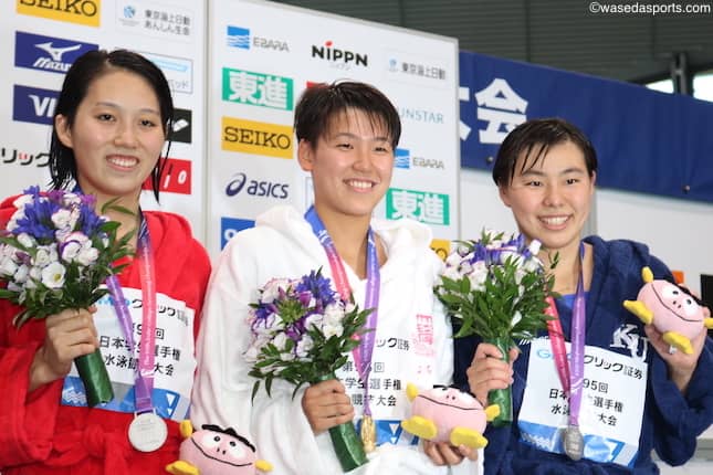 また、男子1500メートル自由形決勝には古畑海生(スポ2=兵庫・市川)が出場。予選では15分25秒を切る自己ベストをたたき出して3位で決勝進出を果たしたが、決勝ではタイムを落として5位に。「決勝ではメダルを狙いにいった」と話す古畑は、「ベストを2本出す力がないといけない」と悔しさをにじませた。これからのさらなる飛躍と、来年以降のメダル獲得を期待したい。