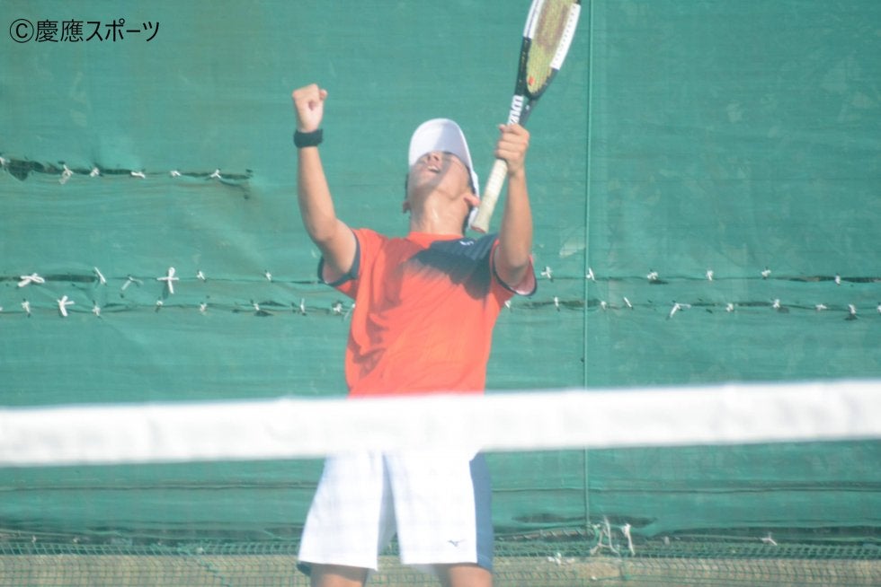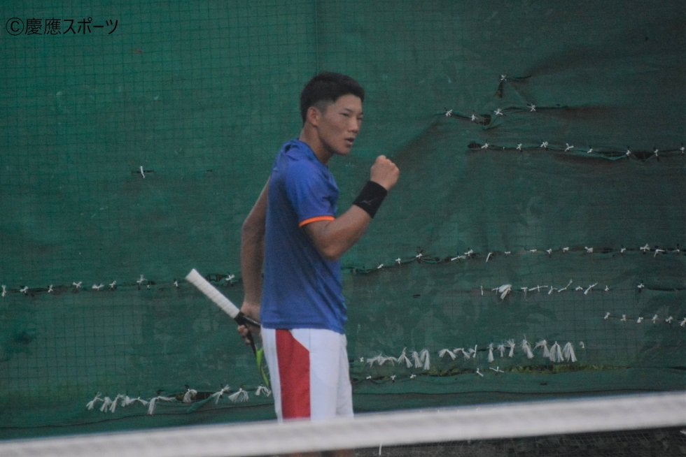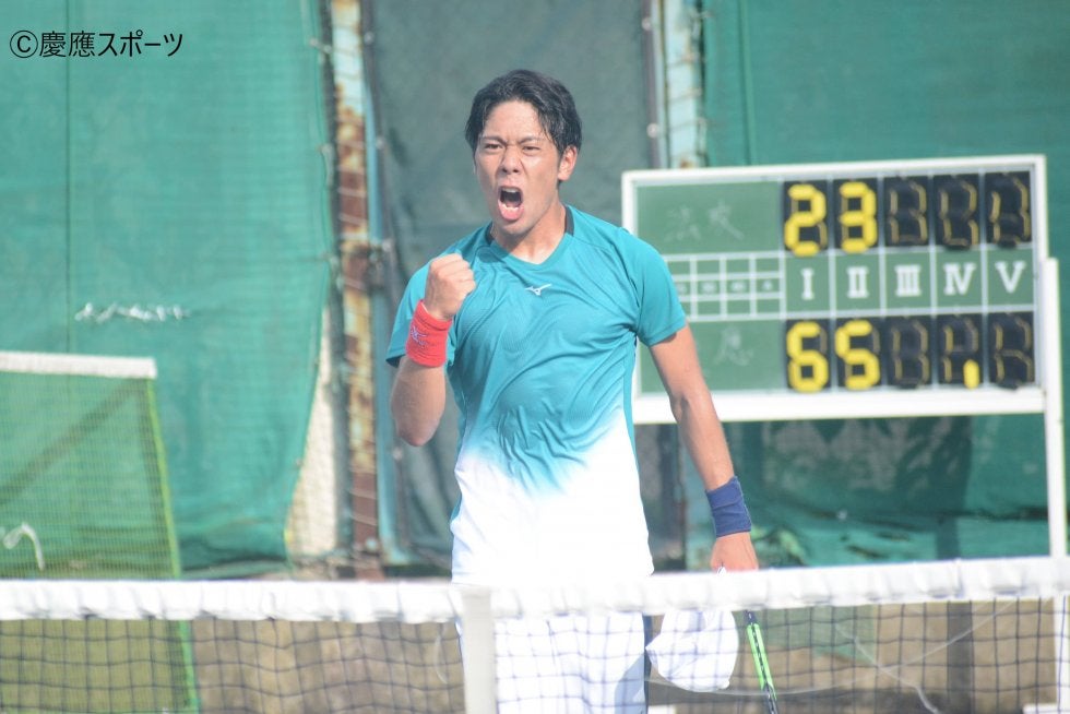 勝敗を分ける最後の1本では今村が法大エース・岡垣と激突した。両者は序盤から力強いストロークで打ち合い、一進一退のゲームを展開する。そんな中、長いラリー戦を制した今村が8ゲーム目をブレークに成功すると、次ゲームもそのまま強烈なサーブで相手を圧倒し6-3で第1セットを先取する。勢いそのままに臨んだ第2セットだったが、法大エースも簡単に流れを渡さない。白帯すれすれを通る今村のボールにミスなく食らいつき、両者の打ち合いはさらにヒートアップしていく。緊張の中5-5で迎えた相手のサービスゲーム、ここで今村が15-40から巻き返してブレークする勝負強さを発揮。両校の応援が白熱する中、今村は最後まで集中力を切らすことなく攻めたボールを打ち続け、第2セット7-5で試合終了。運命のエース対決を制し、慶大の勝利を決めた。