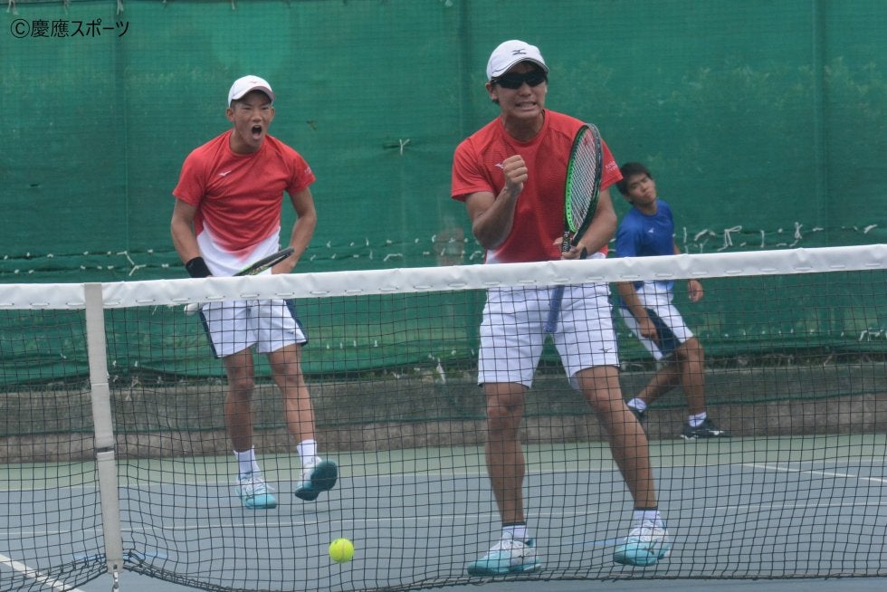 フルセットまでもつれ込む大接戦となったD2川島颯(総3・名古屋)・羽澤慎治(環2・西宮甲英)組の試合。一進一退の攻防が続く中、第9ゲームでブレイクに成功すると、第1セットを6-4で先取する。しかし、第2セットでミスが増え、主導権が相手に。3-6でこのセットで落とし、勝負は最終セットへ。最終セットはタイブレークまでもつれ込むが、最後は川島・羽澤組がネットプレーで相手のミスを誘発し、7-4でタイブレークを制した。ダブルスで貴重な1勝をもぎ取った。