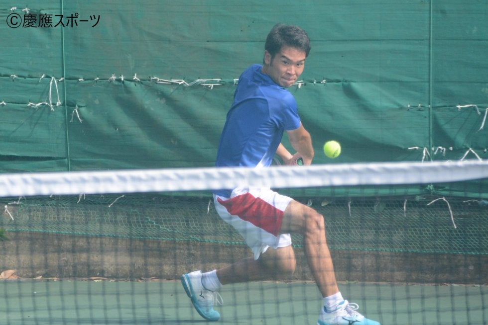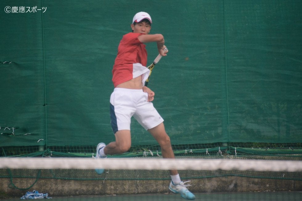 S2羽澤慎治(環2・西宮甲英)は、勝ちきらないといけない相手に対し終始圧倒した試合を見せた。第1セット1ゲームからブレークに成功すると、得意のネットプレーを武器に第5ゲーム、第7ゲームのブレークにも成功し、第1セットを6ー2で取る。流れに乗る羽澤は、第2セット5ゲーム目に、相手の背後をつく技ありのロブショットを見せるなど終始完成度の高いテニスを見せストレート勝ちを収めた。劣勢に立つ慶大の流れを変え、S1今村に繋ぐ試合を展開した。