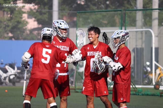 最終第4Q4分、法大のファウルにより、早大はエキストラマンオフェンス(数的に有利な状態)となる。この状況を生かしたい早大は、小林からのアシストを受けたMF中小路渉(社4=埼玉・川越)が弧を描くような軽やかなシュートを決めリードを広げると、続く7分、岡田が法大のファウルによって体勢を崩しながらも押し込み、追加点を挙げた。「最初は(点が)入ったってわからなかったのですが、ヘルメットが飛んだ時に周りが盛り上がっていたので最高でした」と岡田。岡田の勇気あるプレーに対し、会場全体から熱い声援が送られた。その後も早大は着実に得点を重ね、11−5で試合終了。試合後の選手たちの顔には爽やかな笑顔が浮かんだ。
