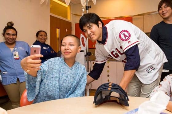 エンゼルスの大谷翔平投手は10日(日本時間11日)、本拠地インディアンス戦の試合前に同僚のシモンズ、フレッチャーとともに球場周辺の小児病院を訪問。およそ2時間に渡って小児がん病棟の患者を慰問した。しかし大谷の場合は励ましにいったというよりは、一緒に楽しんだようだ。