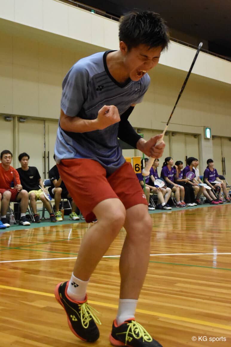 <写真・第1シングルスとして点を決め、ガッツポーズをする戸内> 9月11日、近畿大学東大阪キャンパスにて関西学生バドミン…