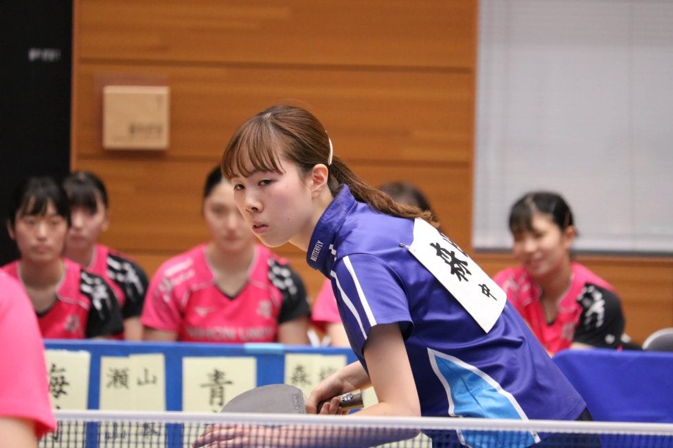 1番でTリーグ・TOP名古屋にも参戦している森田彩音(中央大学)が大島奈々(専修大学)に勝利するも、2・4・6番のシングルスは専修大学が勝利、3・5番のダブルスは中央大学ペアが勝利とシーソーゲームを繰り広げた。3-3で迎えたラストでは、Tリーガー・梅村優香(中央大学)が永道麻依加(専修大学)に勝利。中央大学が全勝をキープした。