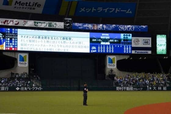 7回のソフトバンクの攻撃前にLビジョンでメッセージ西武 – ソフトバンク(12日・メットライフ) 西武が12…