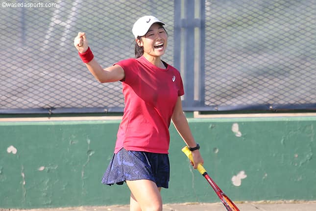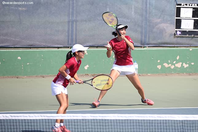 ダブルスの布陣はこれまでのリーグ同様、ダブルス1に清水映里(スポ3=埼玉・山村学園)・石川琴実(社1=神奈川・白鵬女子)組、ダブルス2に下地奈緒(社3=沖縄尚学)・吉岡希紗(スポ1=三重・四日市商)組。対する慶大はダブルス1に佐藤南帆・永田杏里組、ダブルス2に平田歩・末野聡子組と春の早慶対抗試合と同様の顔合わせとなった。ファーストセット序盤はペースをつかめず、カウント1−5まで追い込まれた下地・吉岡組だが、続くゲームをブレーク奪うと勢いに乗り、ここから一気に5ゲームを連取。持ち込んだタイブレークも制し、ファーストセットを逆転でものにした。セカンドセットも2ゲームを先行される展開となったが、吉岡のストレート、下地のネットプレーで相手の懐を突いていき、巻き返しに成功。接戦となったこのセットも6−4で取り切り、早大に1勝目をもたらした。しかし、シングルス1の清水・石川組はインカレ女王ペアの佐藤・永田組に対し3−6、7−5で敗戦。それでも春の早慶戦では手も足も出なかった相手に対し善戦し、勝負のシングルスに臨む早大に光明を与えた。