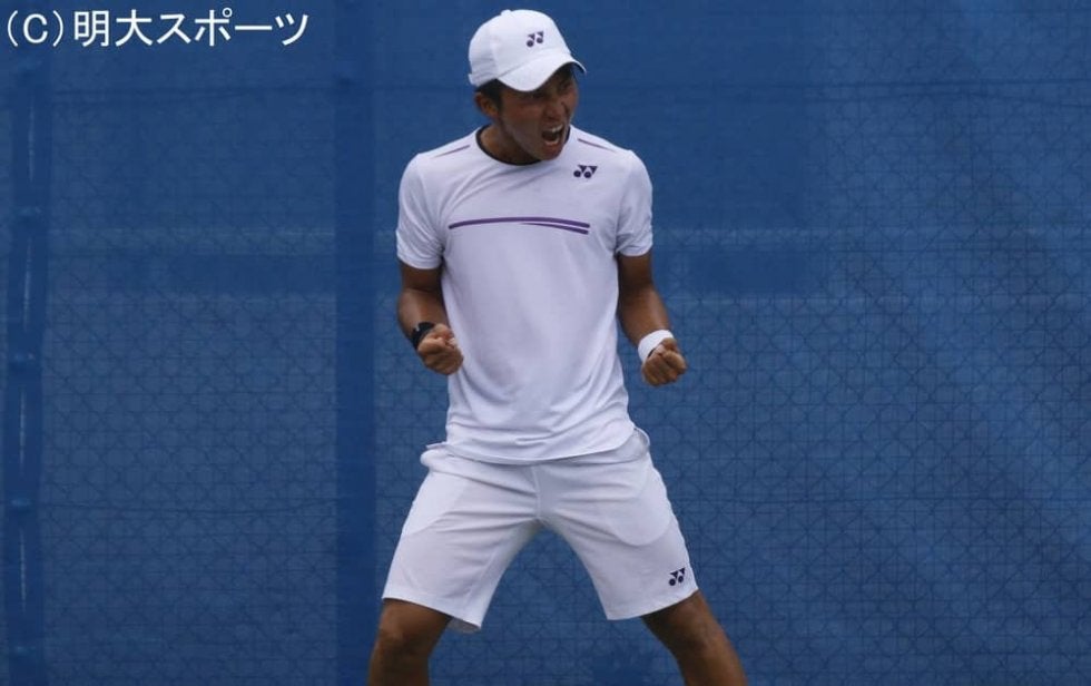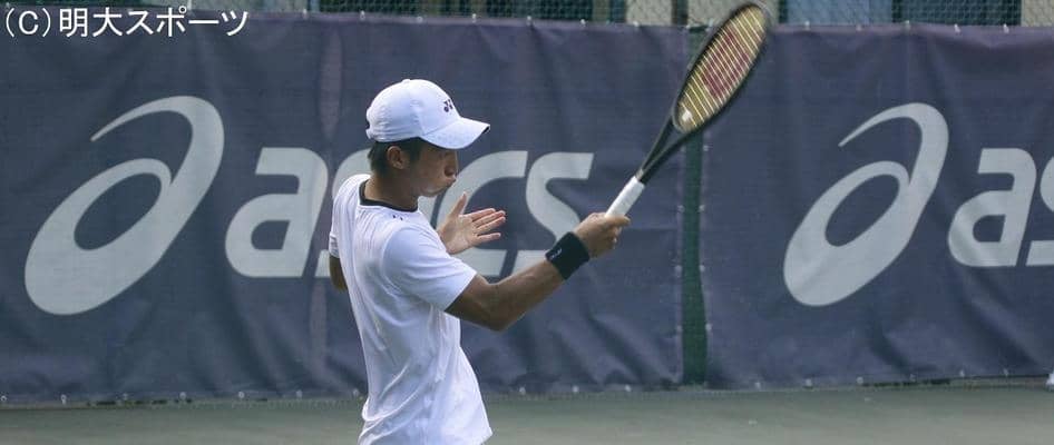 接戦をつかみ取ることができなかった。第1セットは立ち上がりこそ0-2となり苦しむも、「リターンが上手くいった」(藤永啓人・営2=海星高校)。力強いストロークを冷静にはじき返し、6-3でこのセットを奪取。「このままいけると思った」(田中瑛士・商2=東京学館新潟)。しかし相手はインカレ・ベスト8の強敵。第2セットは主導権を握れず、3-6で落とす。勝負の第3セットでは打って変わって拮抗(きっこう)した展開となり、5-5まで詰め寄るも「気持ちの弱さが出てしまった」(田中)。ラインぎりぎりのボールに食らい付けず2ゲームを連取され、5-7で惜しくも敗北。悔いの残る結果となった。