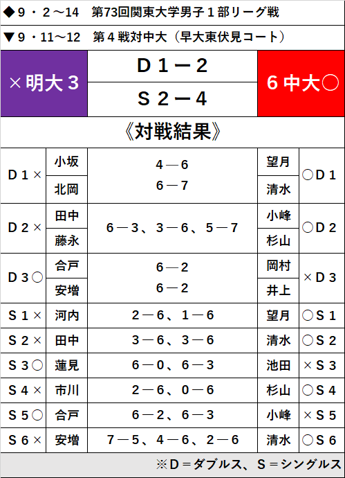 初白星獲得を懸けて挑んだ相手は昨年1ー8で大敗した中大。借りを返したい明大はダブルスで1-2と負け越すも、合戸廉太朗主将(法4=大分舞鶴)がダブルスに続きシングルスでも勝ち星を挙げる大活躍で3-3と巻き返しに成功。しかし反撃はここまで。残りのシングルスを全てストレートで落とし、結果3-6で敗北。今年も入替戦出場を回避することは叶わなかった。