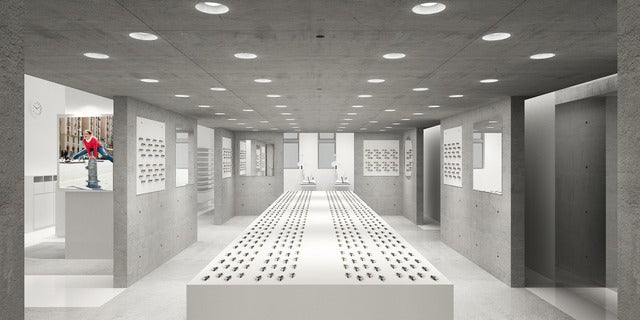 店舗内には、コンクリートで仕切られた2つの空間が存在。それぞれの空間には巨大なオリジナル什器を中央に設置し、アイウエアを展示する。2つの空間は、母屋と離れをイメージ。その外を囲う坪庭にあたる空間には、検眼スペースや待合室を設けている。