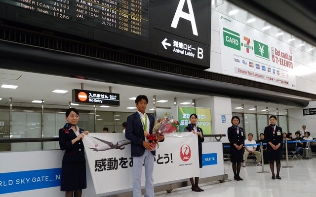 JALでフランクフルトから成田に到着したリオ五輪カヌー銅メダリスト・羽根田卓也選手《撮影 大野雅人(Gazin Airlines)》