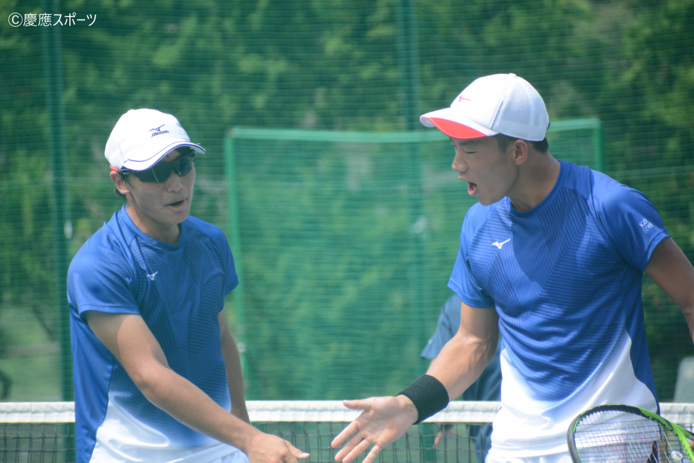 フルセットまでもつれる展開となったD1福田真大(商4・慶應湘南藤沢)・今村昌倫(環3・清風)組の一戦。第1セットは積極的な仕掛けにより早々に相手のサービスゲームをブレークすると、終始主導権を渡さず6-2で奪取。しかし第2セットはデュースまで持ち込むも相手の守備を崩しきれず、流れが悪いまま相手にブレークを許し、2-6で落としてしまう。それでも「気持ちをリセットした」(福田)と話すように第3セットでは福田のボレー、今村のストロークとそれぞれの持ち味を存分に発揮し相手を圧倒。6-2で最終セットを奪い、ダブルスでチームに貴重な1勝をもたらした。