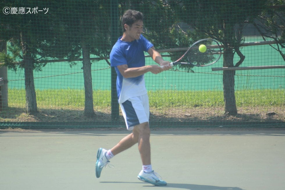 D2の川島颯(総3・名古屋)・羽澤慎治(環2・西宮甲英)は第1セットから苦戦を強いられた。相手のサービスゲームから始まったこの試合、川島・羽澤はリターンでのミスが続き、立ち上がりにつまずく。いつもはネット前での強さが光る2人だが、この日はチャンスボールを捉えきれない場面が多く、リードを奪えず。一進一退の展開となった第1セットはタイブレークの末、相手の勢いに押されるまま落としてしまった。続くセットでは中盤まで互角の戦いを見せるも、5ゲーム目にブレークを許すと、相手のサービスゲームでまたもミスが続き、挽回することはできなかった。ストレートで敗北を喫し、慶大は1-2でダブルスを折り返すこととなった。