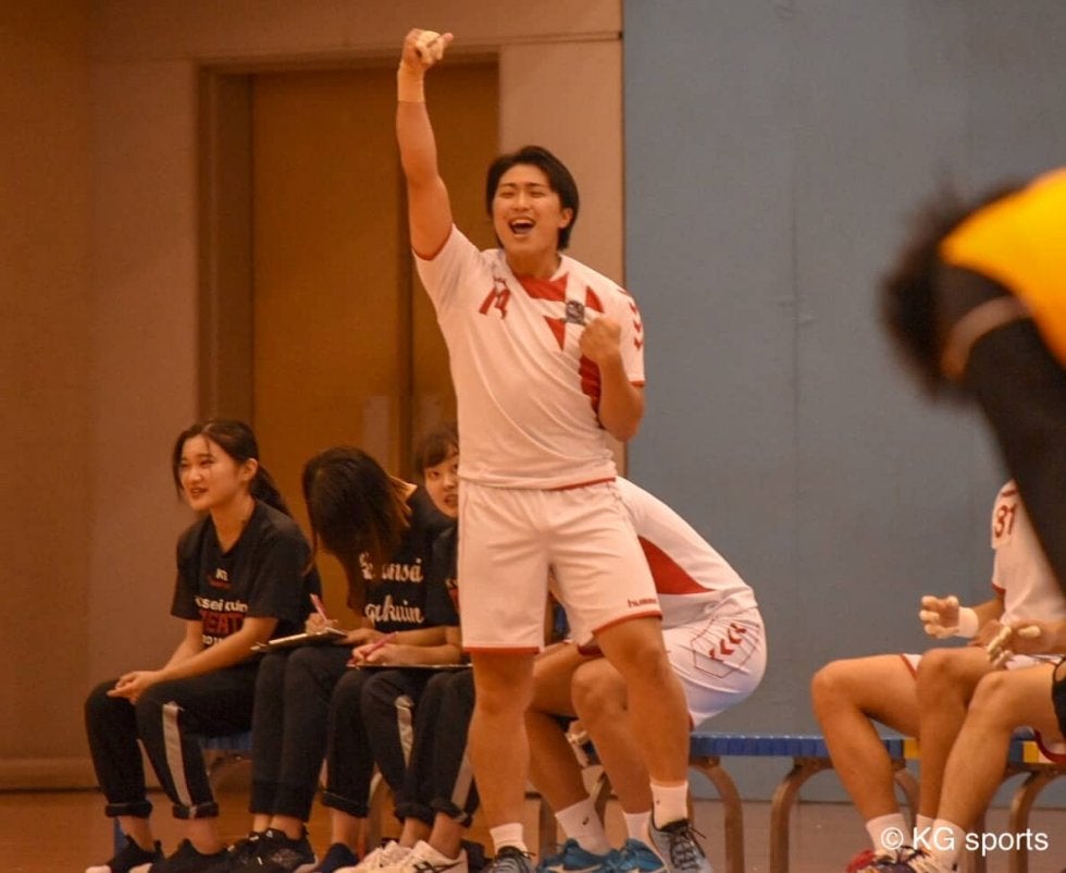 <写真・7メートルスローを決め、ガッツポーズをする福島> 9月14日、2019年度関西学生秋季リーグ戦第4戦が行わ…
