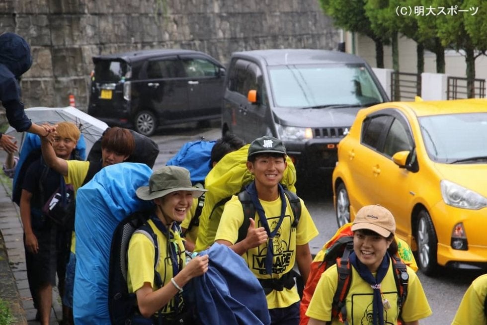 道の歩き方は班によって大きく異なる。コンスタントに歩き続けられる班もあれば緩急付けて歩く班も。6班は上り坂が大得意だ。重いリュックを背負っていると後ろに倒れ込みそうになり体に負荷もかかるが「テンションを上げていきましょう」と声を出し、一層元気を出して上りきった。「目標を捉えました!」と叫ぶなり前方のほかの班に向けて走り出したのは谷村優太(情コミ1=中京大中京)。突飛ながらも彼の無邪気な行動に班員一同笑みが漏れ、ゴールへ向けて歩き出した。