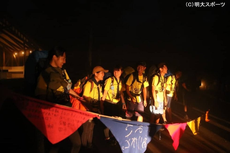 チェックポイント6のゴール間際、部員たちを濃霧が包んだ。もやのかかった暗闇の中、今日までの出来事を思い返すと「ゴールしたくない」と口々に話した。おもむろに手をつなぎ始めると、遠藤も呼ばれ一番端に並ぶ。3年生の幹部や先に到着した部員たちに囲まれてゴールテープを切るとみんなで肩を抱き合った。「去年の自分の班長だった先輩が、自分が班長を務める班で一緒に手をつないでゴールしてくれてぐっときました」(松下)。遠藤にとっては「3年間の中で一番のゴール」となった。