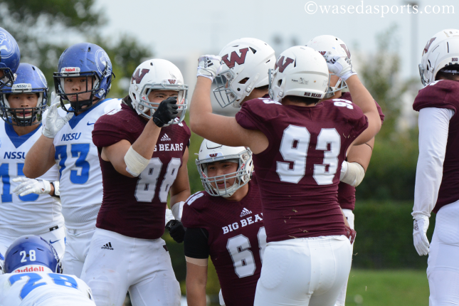 後半からはQB柴崎に代わり、QB宅和真人(政経3=東京・早大学院)・QB吉村優(基理3=東京・早実)が中心に出場。前節活躍したRB広川耕大(社3=東京・早実)、吉澤祥(スポ2=東京・成蹊)そしてRB荒巻俊介(法3=東京・早大学院)など今年から出場機会を増やしている選手がオフェンスを引っ張った。3Qには、チームから期待が寄せられているQB吉村のランでTDをつかみ取った。後半は1TDだけに終わったが、今期台頭してきた選手がしっかりと実力を示した。後半のディフェンスは、試合序盤と打って変わり日体大のオフェンスに完全にアジャストし試合の主導権を握らせない。4Qに入り、このまま無失点で試合を終えたい早大だったが、本日2度目のパントスペシャルを決められてしまい、さらにドライブされこの試合初めてのレッドゾーンの侵入を許す。その後の攻撃を止めたが、ボールの位置はFG圏内。得点を許すかと思われたが、ここで早大がFGブロックに成功。早大に攻撃権が移り、早大の攻撃途中で試合終了。28-0と日体大に快勝しリーグ戦の2勝目を挙げた。