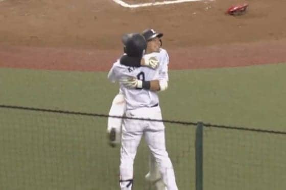 サヨナラを喜ぶ西武・木村文紀(手前)と 熊代聖人【画像:パーソル パ・リーグTV】